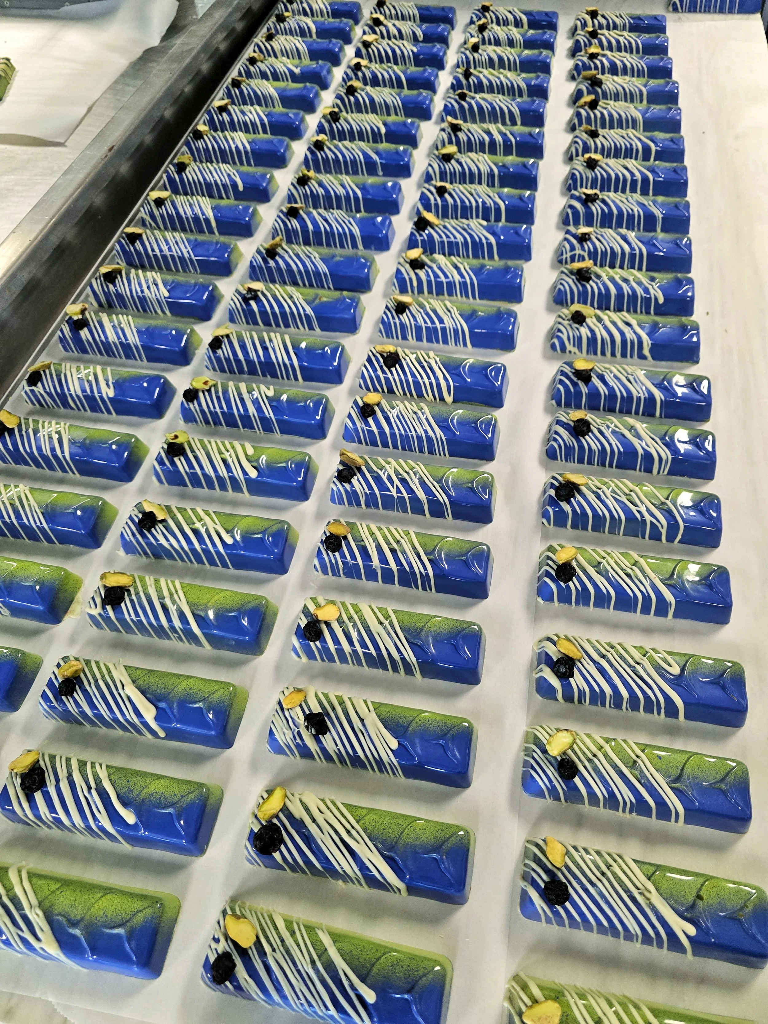 Our goal was to pack as much flavor as we could into a one to two bite treat that she could consume. The result was chocolate! Essentially creating a gourmet chocolate bonbon shell made from high quality imported chocolate and filling the inside with various desserts represented in multiple layers. Our chocolates are hand painted with cacao butter to produce glossy, shiny works of art in vibrant colors that are visually attractive and extremely flavorful. Once you try them, you will agree, they taste even better than they look!